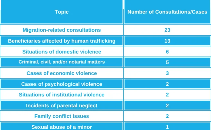 During the first quarter, 37 new consultations were addressed for adults and their dependents, and 22 ongoing cases were followed up, resulting in a total of 68 sessions and 4 accompaniment processes.
